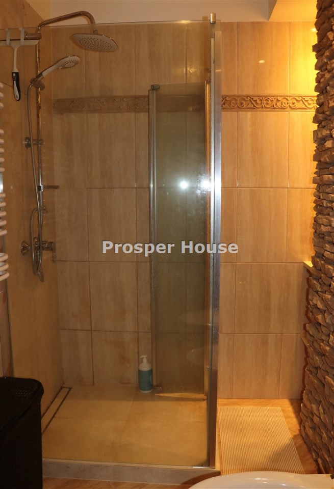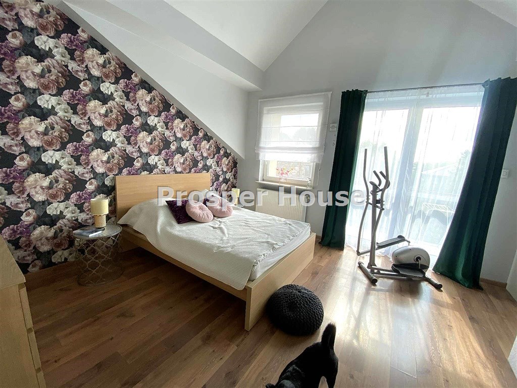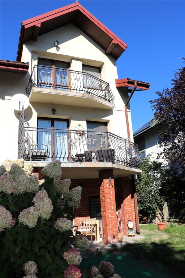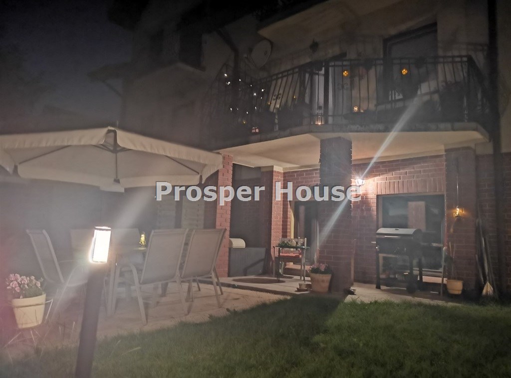 Kuchnia w pełni urządzona (zmywarka, płyta elektryczna, piekarnik, pochłaniacz), meble kuchenne drewniane, dom wyposażony jest w odkurzacz centralny, instalację alarmową, piec gazowy sterowany elektronicznie, okablowanie do zasilenia bramy wjazdowej, brama garażowa segmentowa automatyczna, kominek. Ściany zewnętrzne: cegła Max+styropian 5cm +cegła Max+Styropian 10 cm pokryte tynkiem silikatowym, dach pokryty gontem bitumicznym + blachodachówką poddasze ocieplone 30 cm warstwą wełny mineralnej, okna drewniane, działka ogrodzona, podjazd wykonany z kostki brukowej.