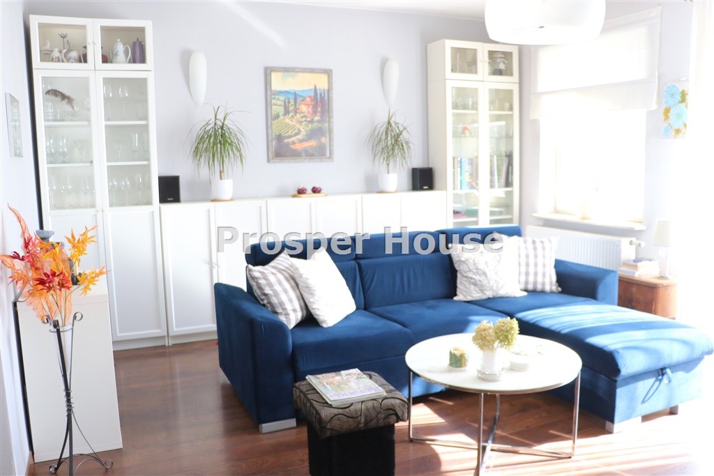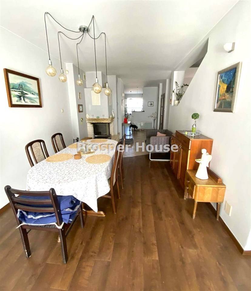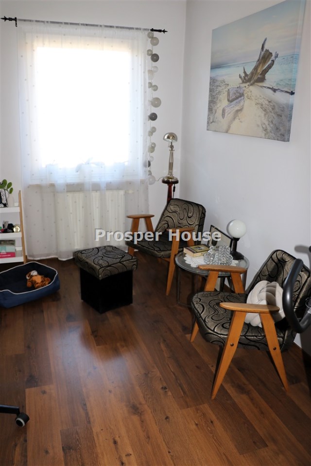 ładna ustawna kuchnia z oknem, meble w zabudowie, mini- spiżarka przy kuchni, jadalnia z kominkiem otwarta na salon 55 m2, z którego wychodzimy na taras (10m2), gabinet/sypialnia 12 m, łazienka 5 m2,