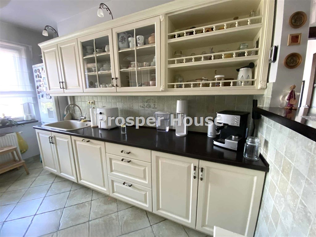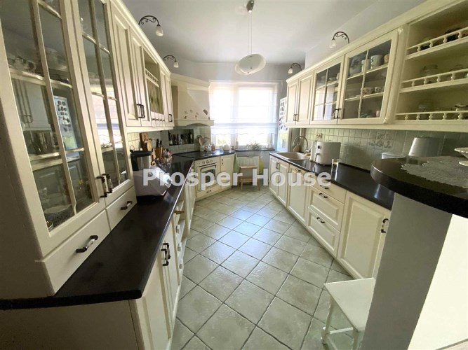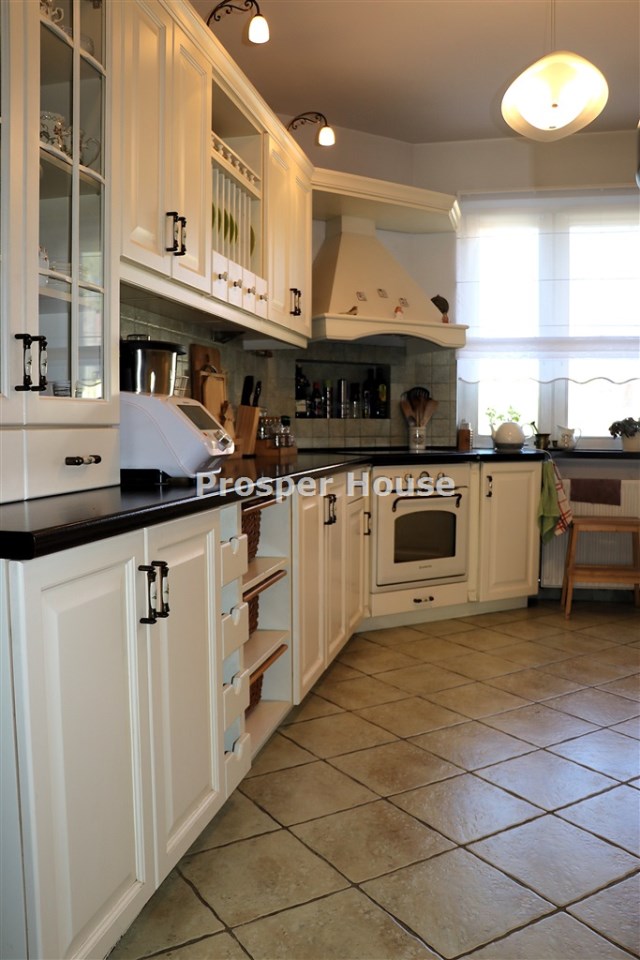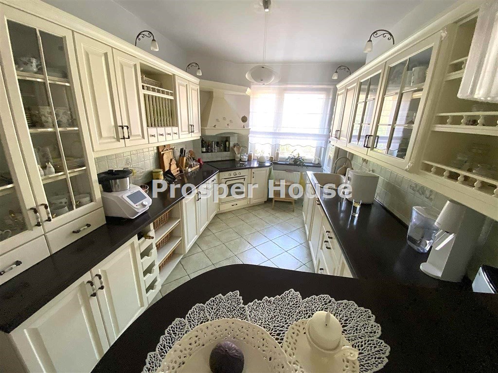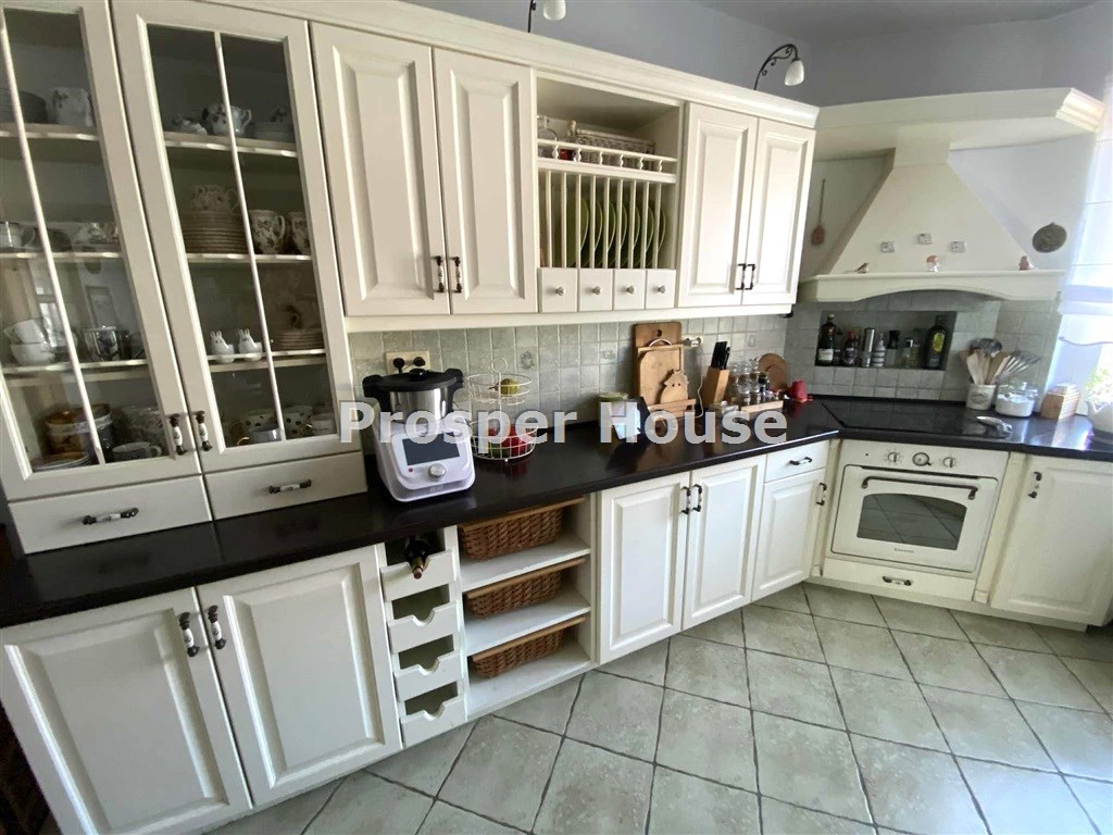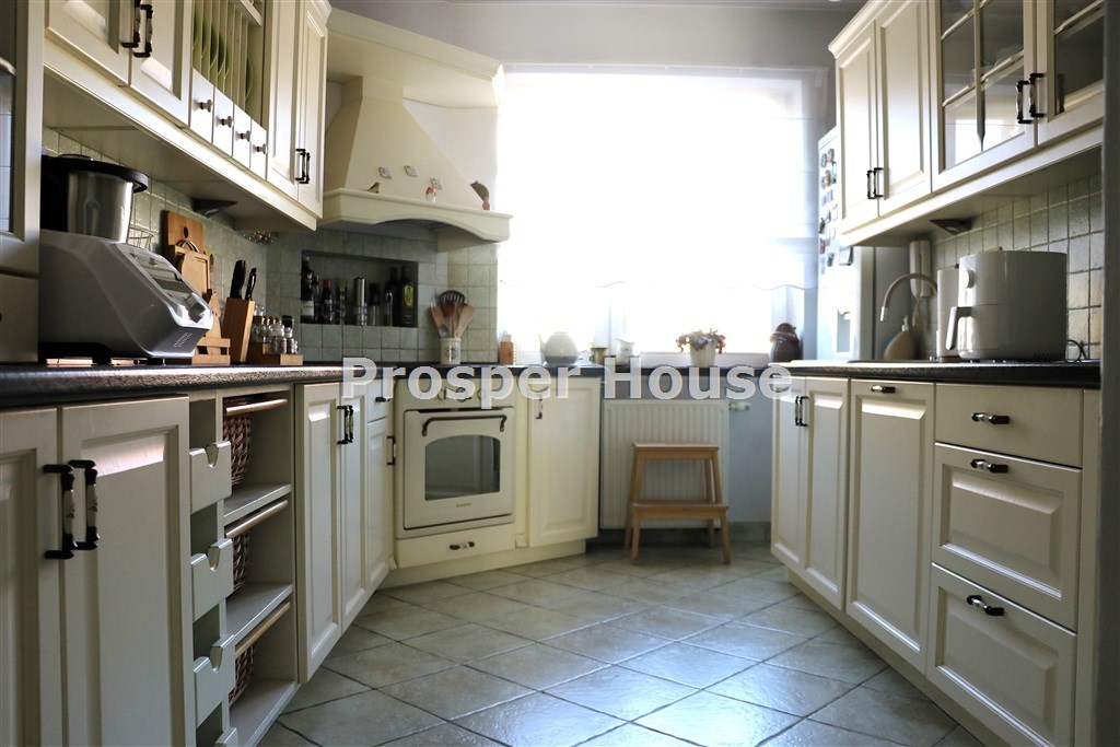 Kuchnia w pełni urządzona (zmywarka, płyta elektryczna, piekarnik, pochłaniacz), meble kuchenne drewniane, dom wyposażony jest w odkurzacz centralny, instalację alarmową, piec gazowy sterowany elektronicznie, okablowanie do zasilenia bramy wjazdowej, brama garażowa segmentowa automatyczna, kominek.
