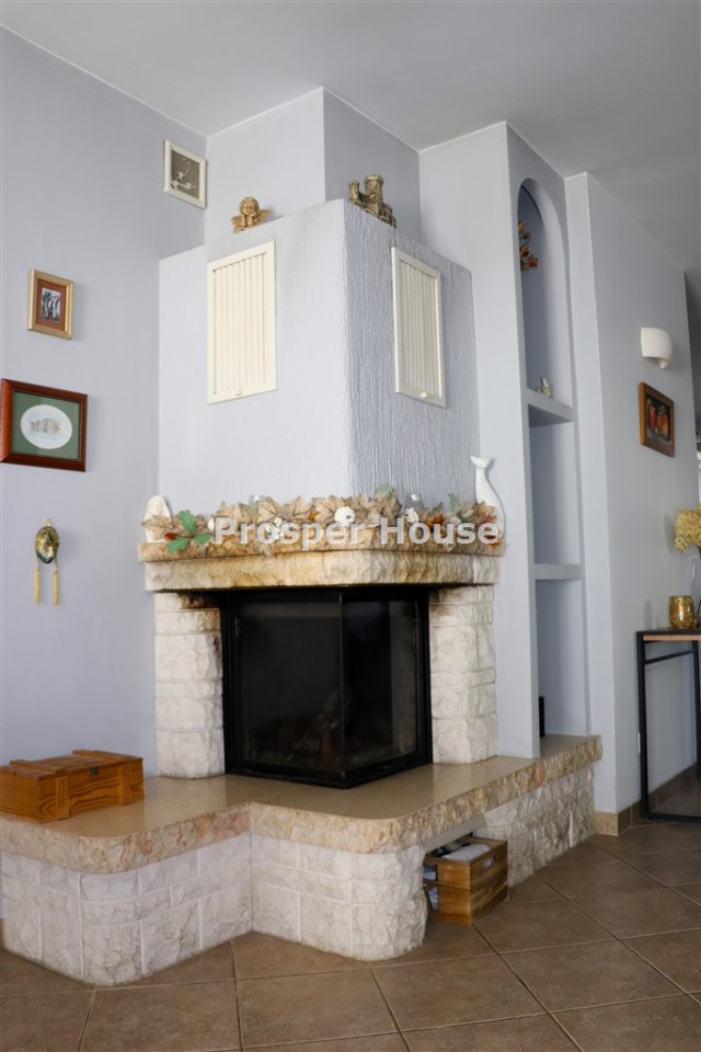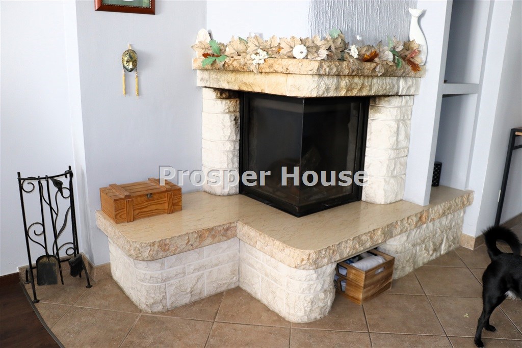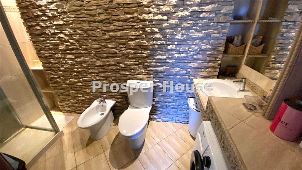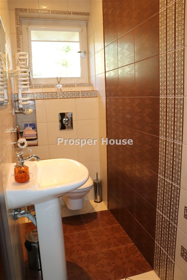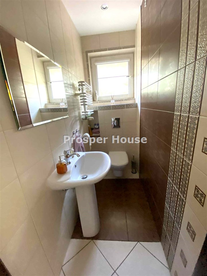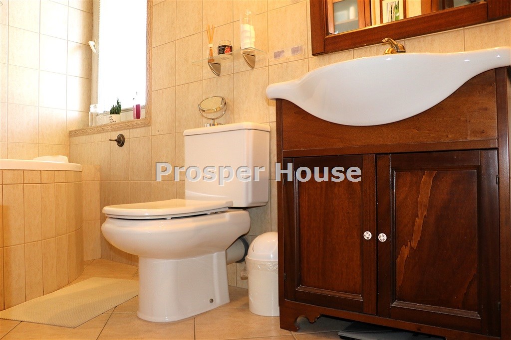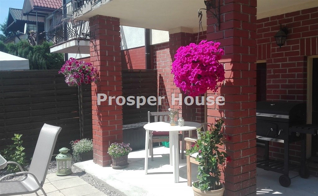 Kuchnia w pełni urządzona (zmywarka, płyta elektryczna, piekarnik, pochłaniacz), meble kuchenne drewniane, dom wyposażony jest w odkurzacz centralny, instalację alarmową, piec gazowy sterowany elektronicznie, okablowanie do zasilenia bramy wjazdowej, brama garażowa segmentowa automatyczna, kominek.