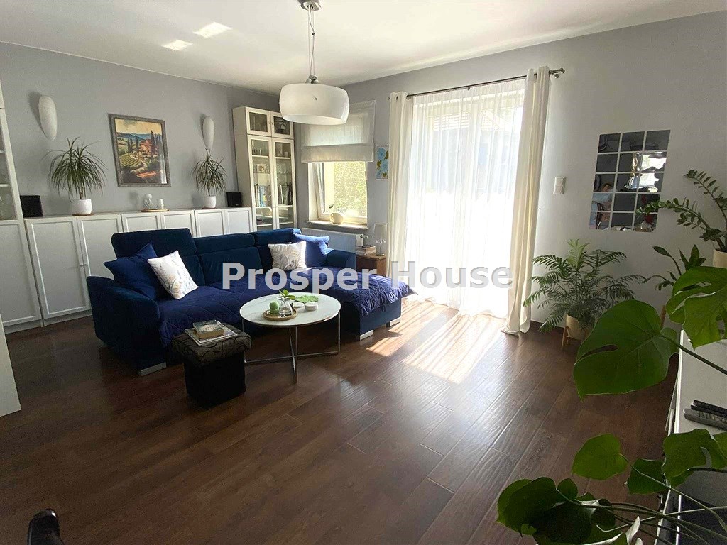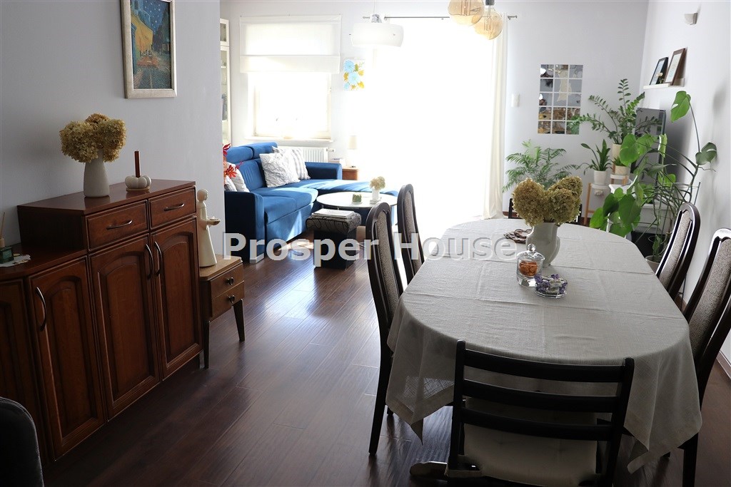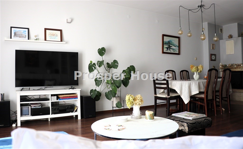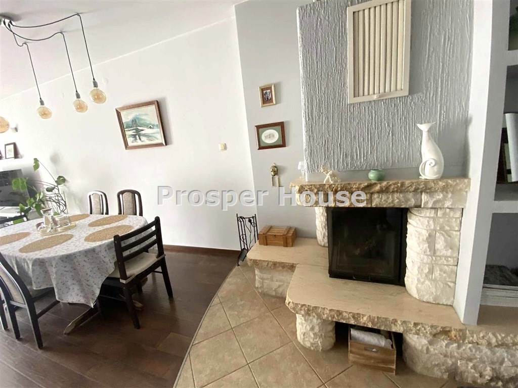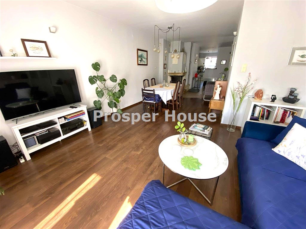 ładna ustawna kuchnia z oknem, meble w zabudowie, mini- spiżarka przy kuchni, jadalnia z kominkiem otwarta na  salon 55 m2, z którego wychodzimy na taras (10m2), gabinet/sypialnia 12 m, łazienka 5 m2,